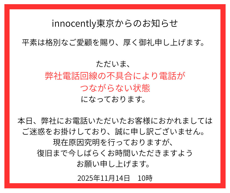 2025.11.14 | NEWS innocently東京 電話回線不通にお知らせ 平素は格別なご愛顧を賜り、厚く御礼申し上げます。 ただいま、弊社電話回線の不具合により電話が つながらない状態になっております。 本日、弊社にお電話いただいたお客様におかれましては ご迷惑をお掛けしており、誠に申し訳ございません。 現在原因究明を行っておりますが、復旧まで今しばらくお時間いただきますよう お願い申し上げます。 前の記事へ 次の記事へ BACK